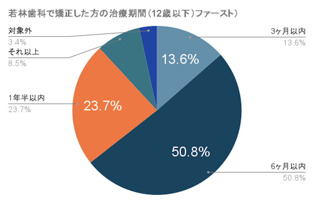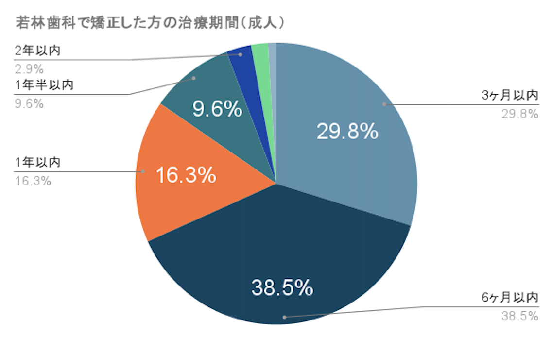 70%が6ヶ月以内に、30%が3ヶ月以内に矯正が完了しています。40代以下であれば70%が3ヶ月以内に矯正が完了しています。